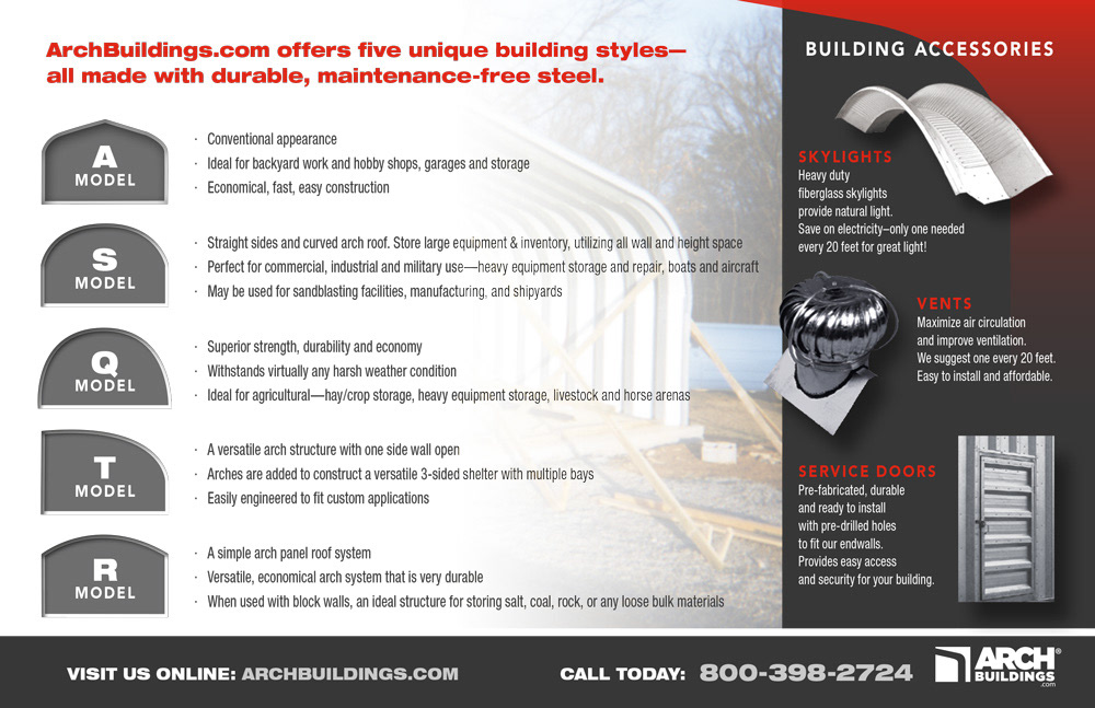 Selected pages from brochure designed for ArchBuildings.com, intended for both digital (interactive PDF) and print formats (8.5" x 5.5").