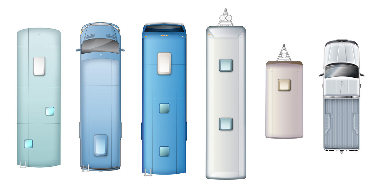 Selected vector illustrations showing aerial views of various RV's, trailers and truck. Used as size reference images for metal garages and carports, in various informational materials. Client: Elephant Structures.